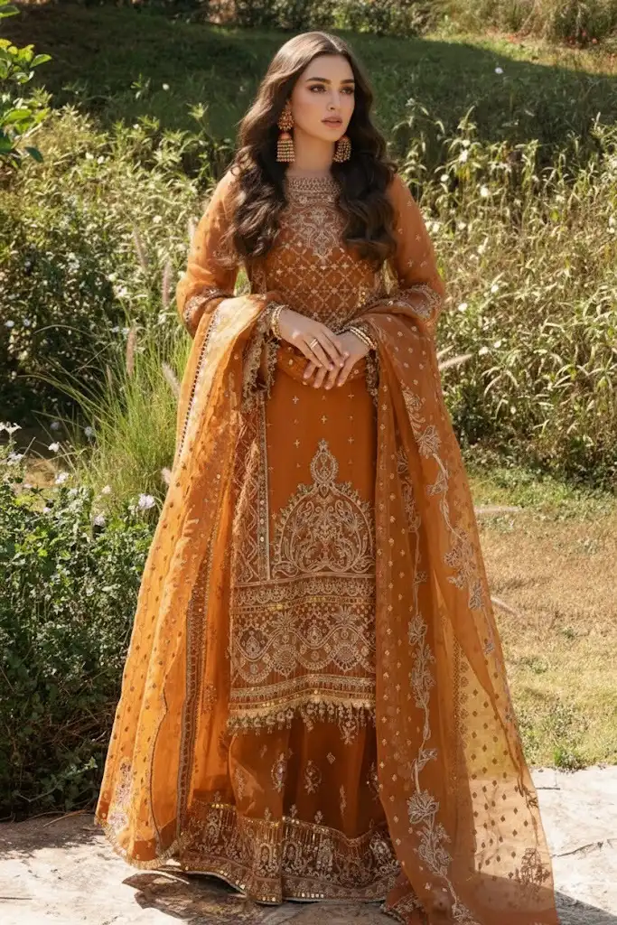 This luxurious outfit features a neckline adorned with heavy embroidery, Tilla work, sequins, and intricate sheet work,