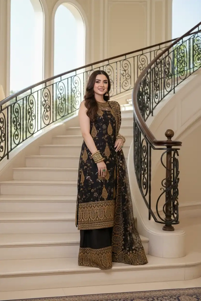 The midnight black ensemble from Asim Jofa’s “MERA HASEEN JORA” collection is a masterful blend of texture and embellishment.