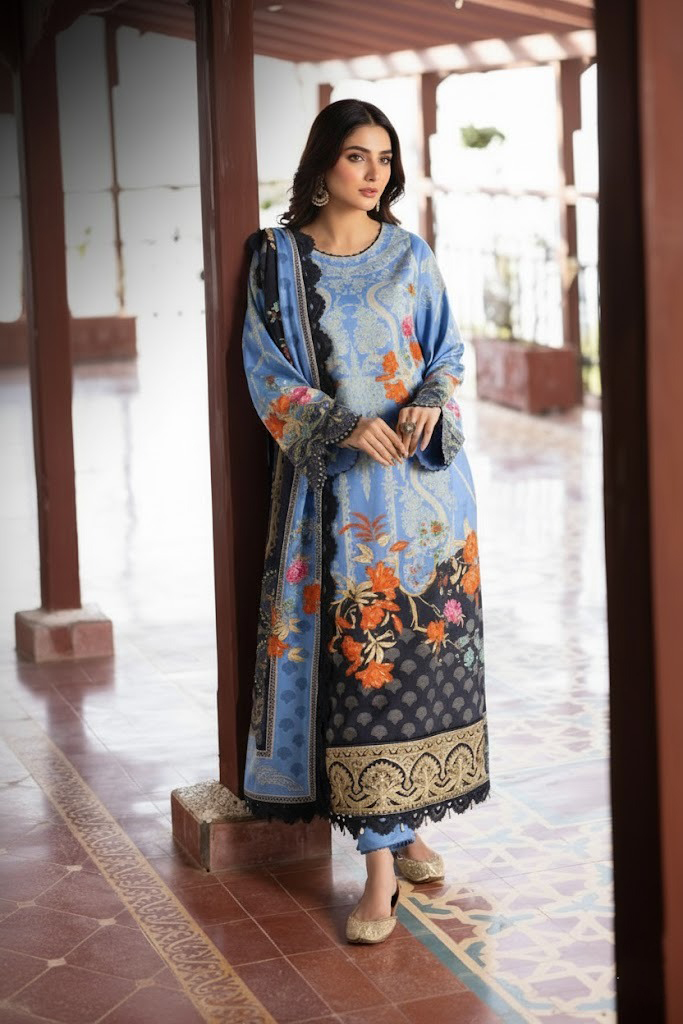 Soft and serene, this light blue piece evokes a sense of calm. The delicate printed design and embroidered neckline offer subtle elegance, while the printed dupatta flows like a winter breeze, making it an ideal choice for effortless style.