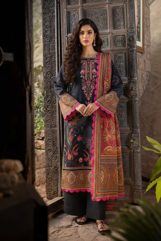 Timeless and versatile, this black ensemble is perfect for creating a sleek, sophisticated look. The gorgeous floral print mirrors a blooming garden, the contrasting shade adds depth and texture to the fabric, while the printed dupatta provides the finishing touch, offering elegance for a polished, refined appearance.