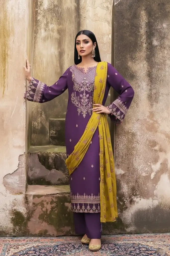 Embroidered Shirt On Raw Silk Plain Trouser On Raw Silk Printed Dupatta On Chiffon