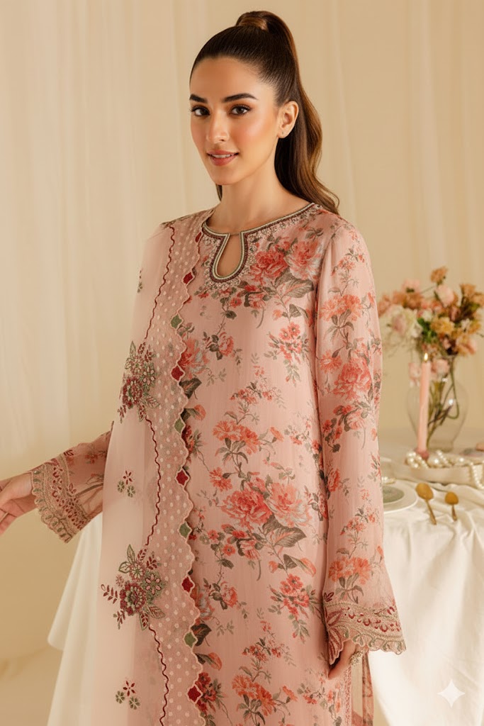 Embroidered And Embellished Chiffon Shirt Embroidered Organza Dupatta Dyed Rawsilk Inner And Trouser